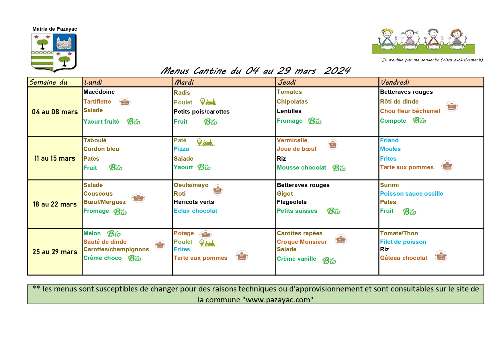 Menus du 04 au 29 Mars 2024