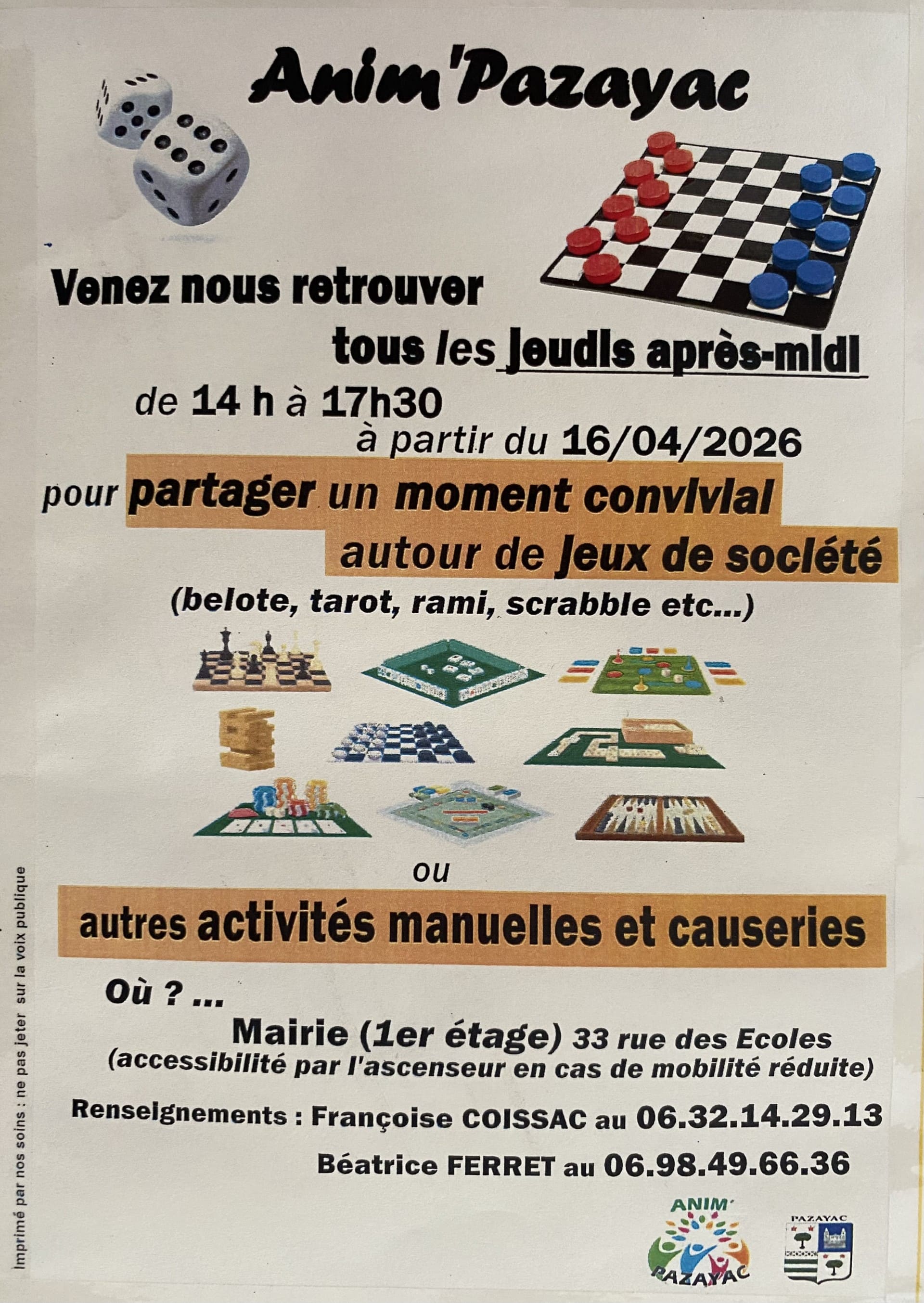 Anim'Pazayac vous propose tous les jeudis après midi de 14 h à 17 h30